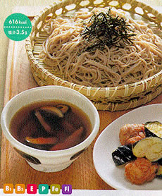 とろろそばは熱湯で5分ゆでる。 ざるに上げて水洗いをし、水気 をきって器に盛り、きざみのりをの せる。つけづゆにそば、具をつけて